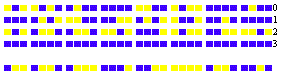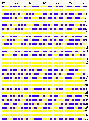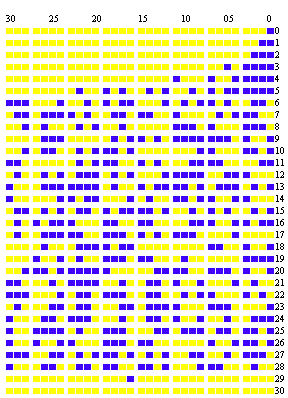 system, and the yellow squares representing zeroes. The first line is the residue V25; the first thirty-one lines numbered from 0 to 30 represent the square of V25; the four lines numbered 0, 1, 2, 3 at the bottom of the figure give the addition of the units of each column, with the carries; one subtracts 2 or the unit of the second column to the right; finally the last line is the residue of V26.